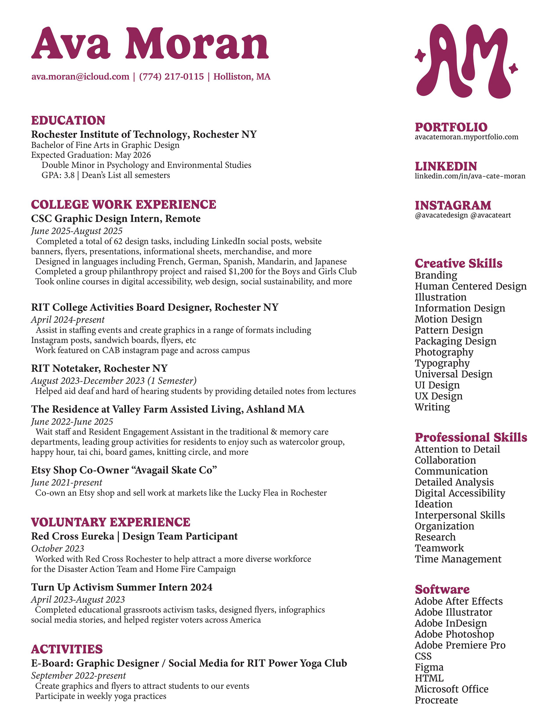 Hi there! My name is Ava Moran and I am a passionate graphic designer and illustrator currently getting by BFA in graphic design from RIT along with a double minor in psychology and environmental studies. I am enthusiastic about ethical design, human-centered design, and visual storytelling and always implement accessibility into my work. My style can be defined as illustrative, refined and colorful but I am easily able to adapt to whatever a client may need. I love creating work with an approachable and organic style while implementing lots of detailed imagery.
